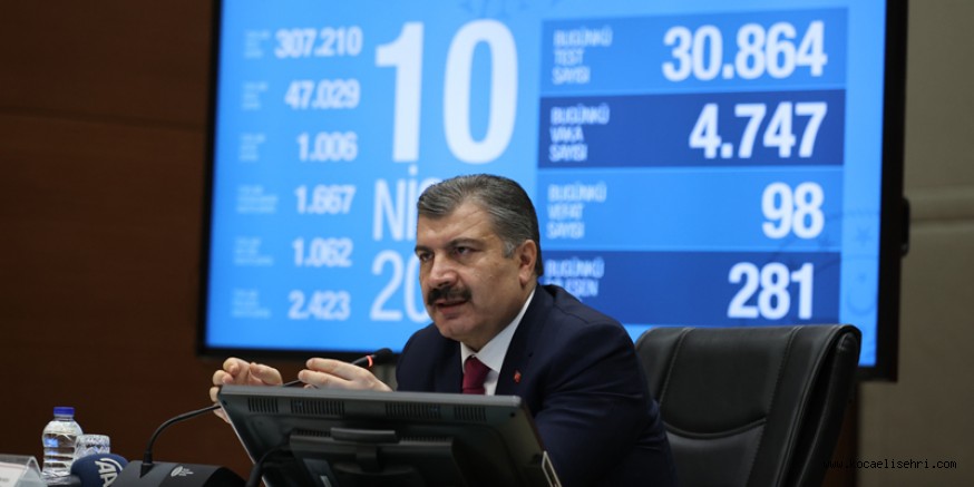 Salgının Türkiye’deki seyri hakkında bilgi veren Koca, “Bugün toplam test sayımız 307 bin 210 oldu. Bugün 30 bin 864 yeni test yaptık. 4 bin 747 yeni vakamız var. Bugün vefat eden 98 vatandaşımızla beraber toplam vefat sayımız 1006 oldu. Bugün iyileşen 281 vakamızla beraber toplamda 2 bin 423 hastamız iyileşti” dedi.
