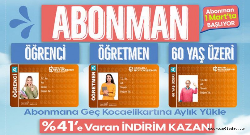 Kocaeli’de bir ilk olan Abonman İndirimli Kartlar uygulamasından; Milli Eğitim Bakanlığı ve Yükseköğretim Kurumu sistemine kayıtlı olan öğrenciler, öğretmen ve 60 yaş üzerindeki vatandaşlar yararlanabilecek. Mart ayında başlayacak uygulama için abonman kart değişimleri başladı. Abonman indirimli karta geçenler %41’e varan indirimden faydalanacak.