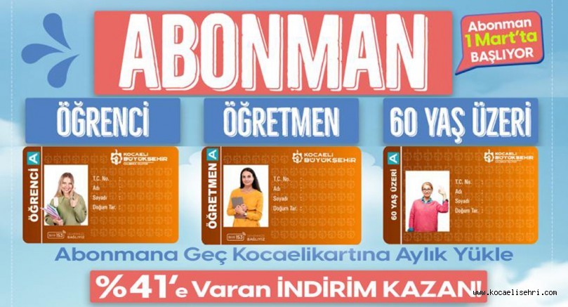 Kocaeli’de bir ilk olma özelliği taşıyan uygulamadan yararlanabilecek vatandaşlar, Kocaeli Kartlarını abonmana uygun yeni kartlar ile değiştirmesi gerekiyor. Değişim işlemleri İzmit, Gebze ve Gölcük’teki seyahat kartları ofislerinden ücretsiz olarak yapılıyor. Yetkililer, mevcut kartların sağ köşesinde A harfi olan kartların abonman uygulamasına uygun olduğunu bildirdi. Bu kapsamda A harfi ile başlayan kartların yenilenmesine gerek yok.
