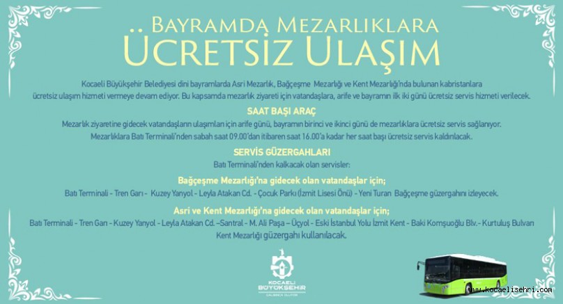 Mezarlık ziyaretine gidecek vatandaşların ulaşımları için arife günü, bayramın birinci ve ikinci günü de mezarlıklara ücretsiz servis sağlanıyor. Mezarlıklara Batı Terminali’nden sabah saat 09.00’dan itibaren saat 16.00’a kadar her saat başı ücretsiz servis kaldırılacak.