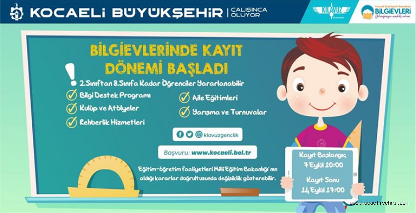 Bilgievleri’nde kayıt dönemi 7 Eylül Pazartesi günü başladı. Bilgievleri’ne kayıtlı olan öğrencilerin www.kilavuzgenclik.kocaeli.bel.tr adlı internet adresinden ders ve kulüp kaydı için başvuru yapması yeterli olacak. Bu yıl ilk kez Bilgievlerine kayıt yaptıracak olan öğrenciler ise yine www.kilavuzgenclik.kocaeli.bel.tr adresinden kayıt yaptırabilecek.