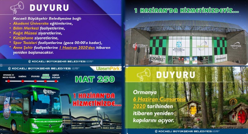 Tüm Türkiye’de olduğu gibi Kocaeli’de de yeni normalleşme adımları uygulanmaya başlandı. Kocaeli Büyükşehir Belediyesi, 1 Haziran (bugün) Pazartesi günü itibariyle pandemi dönemi yeni normalleşme sürecinde bazı merkezleriyle tesislerinde eğitimler, faaliyetler ve ziyaretlere yeniden başladı. Büyükşehir ayrıca İzmit ilçesindeki Şehirlerarası Otobüs Terminali’ni ve Kocaeli’den Sabiha Gökçen’e giden Hat 250 otobüsünü de tekrar hizmete açtı. Açılan her kurum için yeni normalleşme döneminde maske takmak ve sosyal mesafeyi korumanın önemini vurgulayan Büyükşehir, denetimlerin sürekli devam edeceğini belirtti.