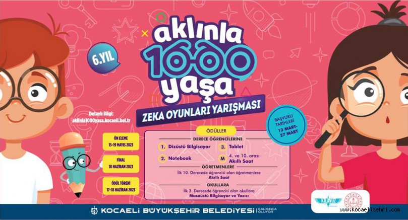Kocaeli Büyükşehir Belediyesi çocukların düşünen, üreten ve karşılaştıkları problem karşısında çözümler bulabilen bireyler olarak yetişmesi için pek çok eğitim faaliyeti gerçekleştiriyor. Bireysel ve grup oyunları ile öğrencilerin yeteneklerinin geliştirilmesi, sosyal gelişimlerinin desteklenmesi, öğrencilere kendilerini ifade edebilme fırsatının sunulması, öğrenciler arasındaki iletişim ve dostluk duygularının geliştirilmesi sağlanacak. Akıl ve zekâ oyunları ile vakitlerini daha verimli geçirmelerinin sağlanması amacıyla bu yıl da ilkokul dördüncü sınıf öğrencilerinin buluştuğu “Aklınla 1000 Yaşa” zekâ oyunları yarışmasını 6. kez düzenliyor.