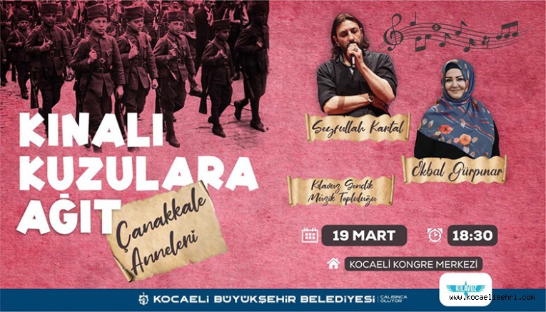 Kocaeli Büyükşehir Belediyesi Gençlik ve Spor Hizmetleri Dairesi Başkanlığı Gençlik Eğitimi Şube Müdürlüğü tarafından, 18 Mart Çanakkale Şehitlerini Anma Günü vesilesiyle düzenlenen bu anlamlı program 19 Mart Pazar akşamı saat 18.30’da Kocaeli Uluslararası Kongre Merkezi’nde düzenlenecek. Şehit ailelerinin de davet edildiği program, protokol konuşmalarının ardından Kılavuz Gençlik Müzik Topluluğu’nun seslendireceği ezgilerle devam edecek. Seyfullah Kartal ve İkbal Gürpınar’ın da katılımıyla, 108 yıl önce kazanılan büyük zaferle Çanakkale’yi geçilmez kılan başta Gazi Mustafa Kemal Atatürk ve silah arkadaşları olmak üzere tüm aziz şehitlerimiz rahmet ve minnetle anılacak.