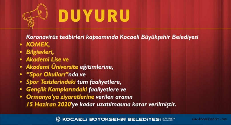Kocaeli Büyükşehir Belediyesi, koronavirüs (Covid-19) ile ilgili yeni önlemler aldı. Bu kapsamda KO-MEK kursları, Bilgievleri, Akademi Lise ve Akademi Üniversite eğitimleri ve Spor Okulları’nda verdiği 3 haftalık arayı 15 Haziran 2020 tarihine kadar uzattı.