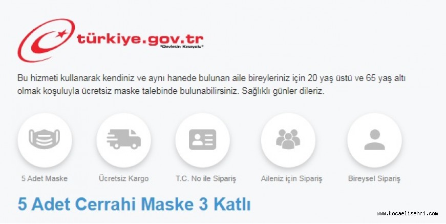 Kendiniz ve hanenizdeki bireyler için 20 yaş üstü 65 yaş altı olmak koşuluyla ücretsiz maske talebinde bulunabilirsiniz..