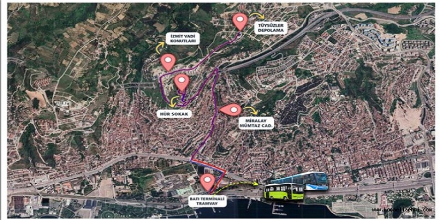 Batı Terminali – İstanbul İzmit Yolu – Miralay Mümtaz Caddesi – Şairane Sokak – Beyhan Sokak – Hür Sokak - Şantiye Sokak – Altun Sokak – Tüysüzler