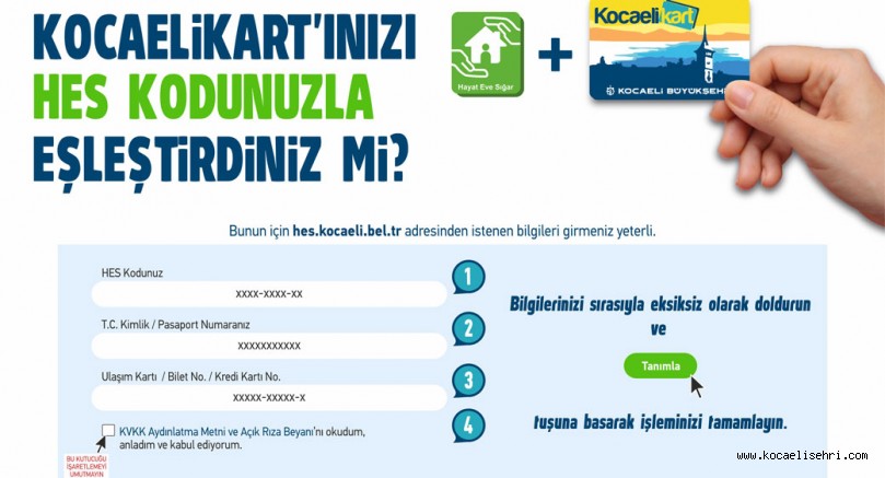 İçişleri Bakanlığı İller İdaresi Genel Müdürlüğü’nün 29.09.2020 tarih ve 15993 sayılı “ Şehir İçi Toplu Ulaşımda HES Kodu Sorgulaması ” konulu genelgesinin ardından, Kocaeli İl Umumi Hıfzıssıhha Kurulu’nda alınan kararlar gereğince; Kocaeli Büyükşehir Belediyesi Ulaşım Dairesi Başkanlığı koordinasyonunda, Bilgi İşlem Dairesi Başkanlığı ve Kocaeli geneline hizmet veren elektronik/akıllı seyahat kart sistemleri yüklenicisi KentKart yetkililerince yapılan çalışmalar sonucunda HES Kodu tanımlama sistemi alt yapı çalışmaları tamamlandı. Vatandaşlar hes.kocaeli.bel.tr web sayfasından ilgili alanları eksiksiz doldurarak kişisel ya da genel seyahat kartlarına HES kodlarını tanımlayabilecek. HES kodu tanımlama işlemleri 29 Kasım 2020 Pazar günü bitimine kadar yapılabilecek.