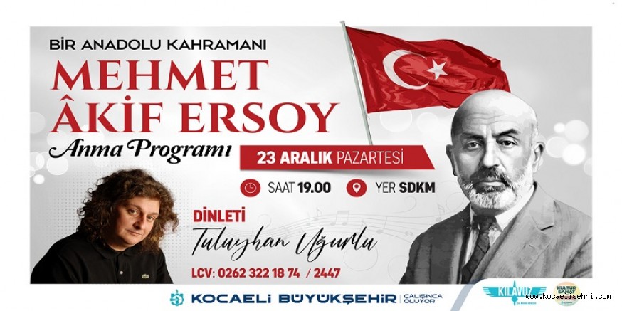 Kocaeli Büyükşehir Belediyesi, İstiklal Marşı Şairi Mehmet Akif Ersoy’u vefatının 88. yıldönümünde düzenleyeceği konserle anacak. “Bir Anadolu Kahramanı Mehmet Akif Ersoy” konulu konser, 23 Aralık Pazartesi akşamı saat 19.00’da SDKM Büyük Sahne’de gerçekleştirilecek. Konserde; Türkiye’nin yetiştirdiği en önemli piyano virtüözlerinden Tuluyhan Uğurlu, Mehmet Akif Ersoy’un şiirlerinden bestelediği eserlerini seslendirecek. Dinleti boyunca müzikle eş zamanlı olarak Mehmet Akif Ersoy’un hayatı, yaşadığı dönem ve şiirlerini anlatan görsel sunumlar yansıtılacak. Anma programına katılmak isteyen vatandaşlar; 0262 3221874/2447 numaralı telefondan LCV yaptırabilecek.