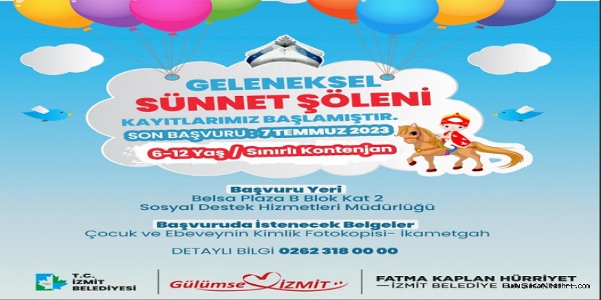 6-12 yaş arası çocukların kabul edileceği toplu sünnet organizasyonunda yapılan değerlendirmelerin ardından başvuruları kabul edilen aileler, çocuklarını anlaşmalı hastanelerde sünnet ettirebilecek. Operasyonların ardından ise büyük bir sünnet şöleni düzenlenecek. İzmit Belediyesi; sünnet kıyafetleri, fotoğraf çekimleri, sünnet konvoyu ve ikramlarla çocuklara güzel bir anı bırakacak.