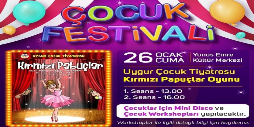 Ayrıca 26 Ocak Cuma günü Çocuk Festivali kapsamında Uygur Çocuk Tiyatrosu şehrimize geliyor. Yunus Emre Kültür Merkezinde ‘Kırmızı Papuçlar’ oyunu saat:13.00 ve 16.00’da iki ayrı seansta gösterilecek. Çeşitli eğlenceler ile çocukların keyifli vakit geçirmesi için hazırlanan programa tüm çocuklar davetli.