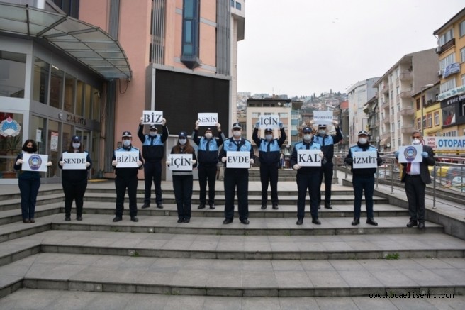 İzmit Belediyesi Zabıta Müdürlüğü ekipleri ellerinde tuttukları yazılarla, “Biz senin için dışarıdayız. Sende bizim için evde kal İzmit” mesajını vererek İzmit halkına zorunlu olmadıkça dışarı çıkmaması konusunda çağrıda bulundu. Vatandaşlara çağrıda bulunan ekipler, “24 saat İzmit halkımızın hizmetindeyiz. Lütfen çocuklarımızın ve torunlarımızın geleceği için zorunlu olmadıkça dışarı çıkmayınız. Evde kal İzmit, evde hayat var” ifadelerinde bulundu.