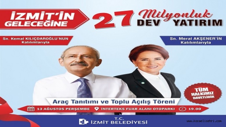İzmit Belediye Başkanı Av. Fatma Kaplan Hürriyet’in son bir yılda gerçekleştirdiği başarılı çalışmalar sonucu gerçekleştirdiği projelerin açılışlarını CHP Genel Başkanı Kemal Kılıçdaroğlu ve İYİ Parti Genel Başkanı Meral Akşener yapacak. 13 Ağustos Perşembe Günü saat 19.00’da İnterteks Fuar Alanı önü otoparkında gerçekleştirilecek toplu açılış töreninde İzmit Belediyesinin kente kazandırdığı 27 milyonluk yatırım olan temizlik hizmet araçlarının tanıtımı yapılacak.