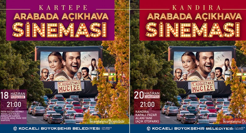 İzmit, Gebze, Derince ve Körfez ilçelerinde gerçekleştirilen arabada sinema etkinliği vatandaşların yoğun ilgisiyle karşılanmıştı. Vatandaşların büyük beğeni ile izlediği etkinlik şimdi de Kartepe ve Kandıra ilçelerinde gerçekleştirilecek. İlk olarak 18 Haziran Perşembe günü Kartepeli vatandaşlar Fatih Sultan Mehmet Mahallesi Kalıcı Konutları karşısı Lojistik Araç Park Yeri’nde arabada sinema etkinliği ile buluşacak. Ardından 20 Haziran Cumartesi günü Kandıralar Kapalı Pazar alanı yanındaki otoparkta “7. Koğuştaki Mucize” filmini izleyebilecek.