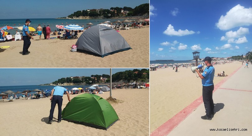Mavi bayraklı plajlarda çadır kurulmaması, uyulması gereken kurallardan birisi olarak öne çıkıyor. Bu kapsamda Zabıta Daire Başkanlığı ekipleri, mavi bayraklı plajlardaki denetimlerinde, kurulan çadırların kaldırılmasını da sağlıyor.