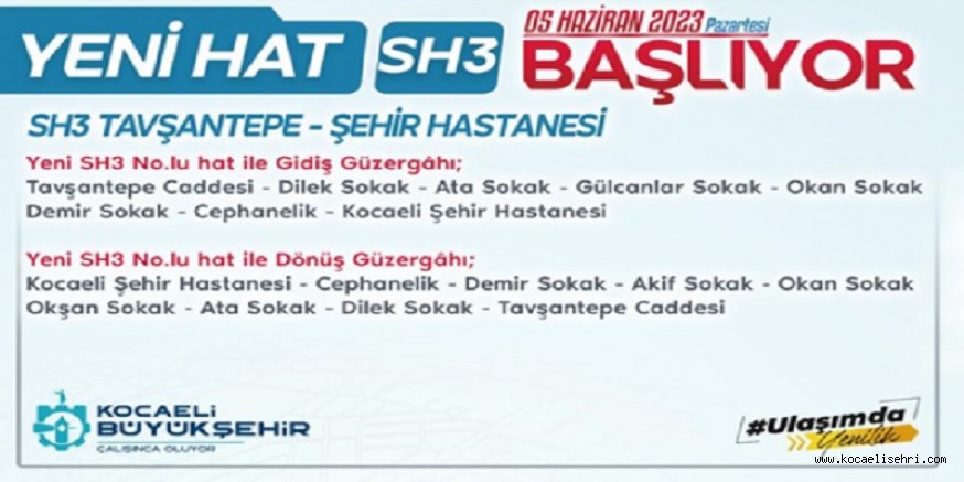 Kocaeli Büyükşehir Belediyesi Nisan ayının ilk haftasında hasta kabulüne başlayan Kocaeli Şehir Hastanesi için ulaşım planlarını düzenlemeye devam ediyor. Ulaşım Dairesi Başkanlığınca şehir hastanesi için 8 yeni hat kuruldu. Bu kapsamda kurulan SH3 05 Haziran Pazartesi günü seferlerine başlıyor.