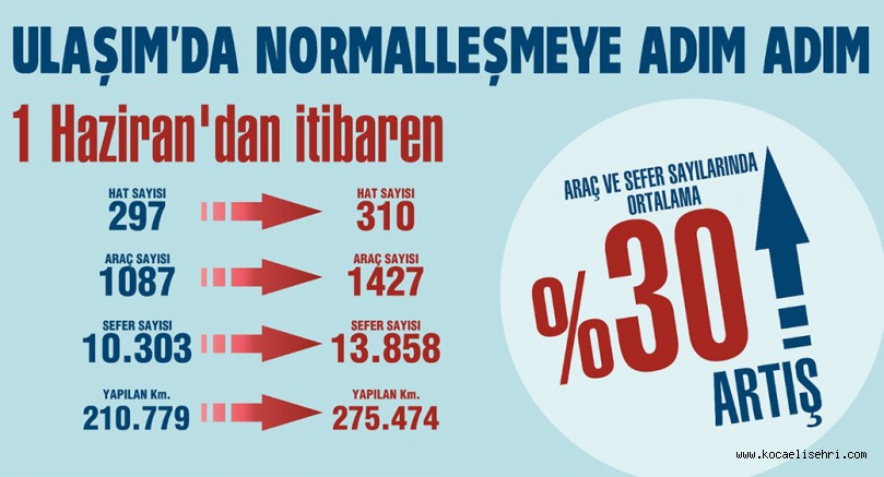 Normalleşmeye geçiş süreci ile birlikte Mayıs ayında toplu taşıma kullanımı bir önceki aya göre yüzde 25 artış göstererek 127 bin olarak gerçekleşti. 1 Haziran tarihi itibari ile bu kullanım 200 binlere kadar yükseldi. Toplu taşımada kullanım her geçen hafta artış göstermesi öngörülüyor.