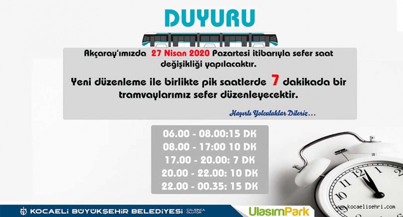 Kocaeli Büyükşehir Belediyesi vatandaşların rahat, konforlu ve güvenli ulaşımlarını gerçekleştirmeleri için Ramazan ayında Akçaray’da da sefer saatlerinde düzenleme yaptı. Yoğun saatlerde 7 dakikada bir geçecek olan Akçaray, vatandaşların sağlıklı bir şekilde ulaşımlarını gerçekleştirmelerini sağlayacak. 06.00 – 08.00 arası 15 dakikada bir, 08.00 – 17.00 arası 10 dakikada bir, 17.00 – 20.00 arası 7 dakikada bir, 20.00 – 22.00 arası 10 dakikada bir ve son olarak da 22.00 – 00.00 arası 15 dakikada bir sefer düzenleyecek.