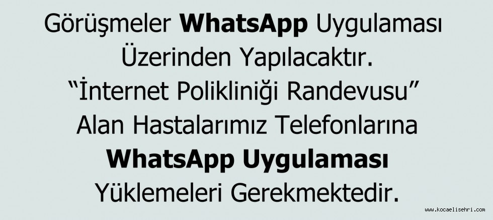 Evden çıkamadığımız bu günlerde sağlık hizmetini sürdürmek amacıyla İnternet Polikliniğimiz hizmete girmiştir. Aile Hekimliği, Gastroenteroloji Polikliniği, Genel Cerrahi Polikliniği ve Psikiyatri Polikliniği internet üzerinden hasta kabulüne başlamıştır. WhatsApp programı telefonuna yüklü hastalar internet üzerinden alacakları randevular sayesinde doktorlar ile görüntülü olarak yüz yüze görüşebileceklerdir.