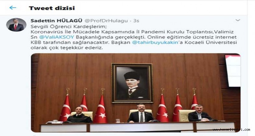 Basına kapalı olarak yapılan toplantıda Kocaeli’de öğrenim gören öğrencileri ilgilendiren önemli bir karar alındı. Kocaeli Üniversitesi Rektörü Prof. Dr. Saadettin Hülagü toplantı sonrası sosyal medya hesabında yaptığı paylaşımda online eğitimde internet imkanının Kocaeli Büyükşehir Belediyesi tarafından karşılanacağını açıkladı. Rektör Hülagü paylaşımında “Sevgili Öğrenci Kardeşlerim Koronavirüs İle Mücadele Kapsamında İl Pandemi Kurulu Toplantısı, Valimiz Sayın Hüseyin Aksoy başkanlığında gerçekleşti. Online eğitimde ücretsiz internet Kocaeli Büyükşehir Belediyesi tarafından sağlanacaktır. Başkan Tahir Büyükakın’a Kocaeli Üniversitesi olarak çok teşekkür ederiz” ifadelerini kullandı.